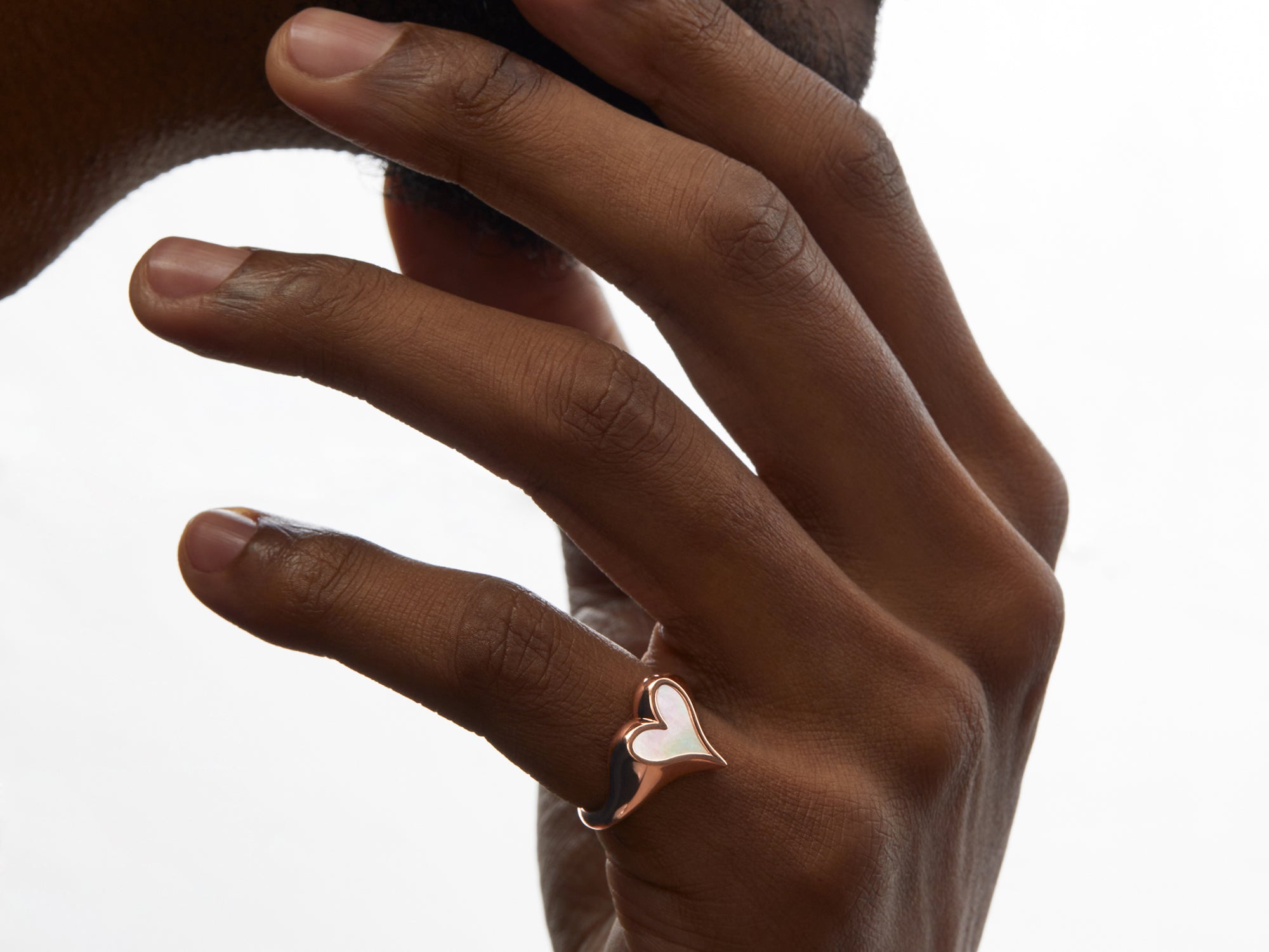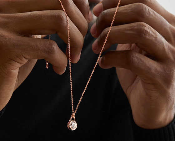 A single round brilliant lab-grown diamond is framed in a bezel setting with the sturdiness of a padlock and the fluidity of joining water drops.