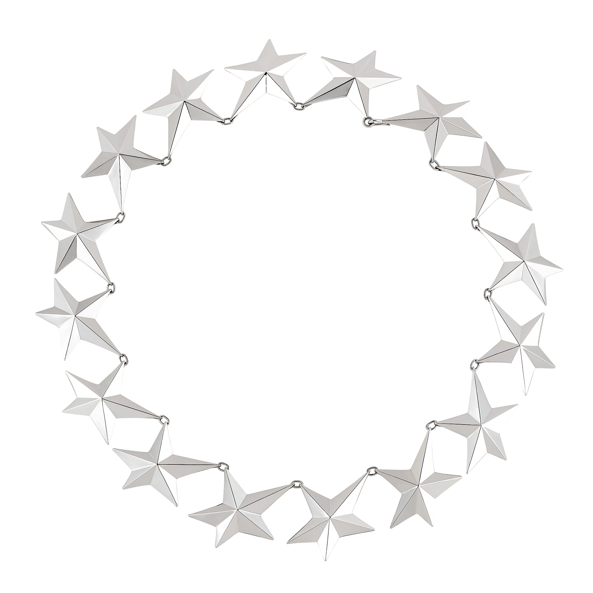 Crafted in sterling silver, the necklace is an expression of angular dimension. Each ray plays with light and shadow, creating highlights and depth with striking modernity.