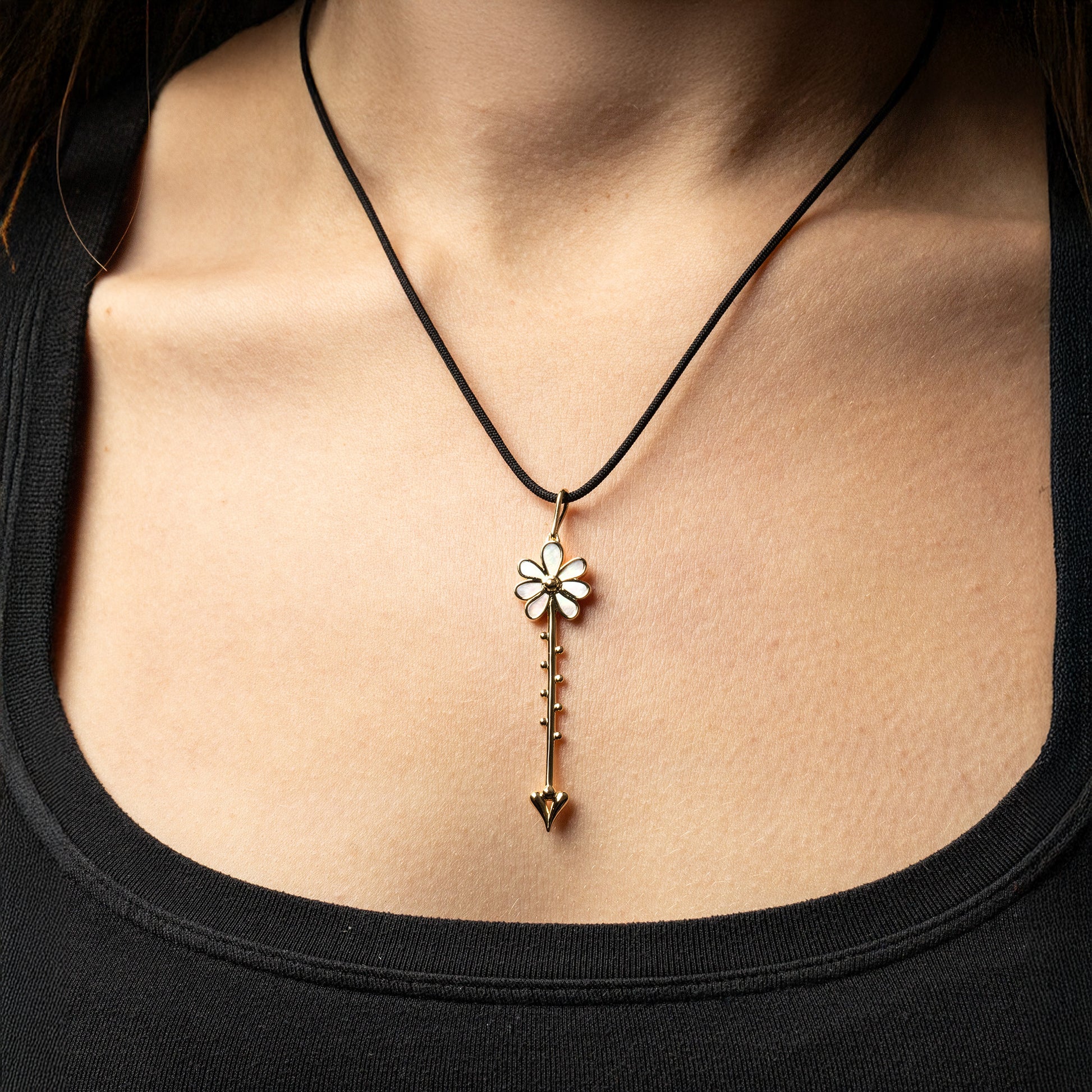 The Bloom Wand is a slender scepter topped with a mother-of-pearl blossom and punctuated by a heart. Wear it to inspire growth and rejuvenation—of the body, mind and heart.