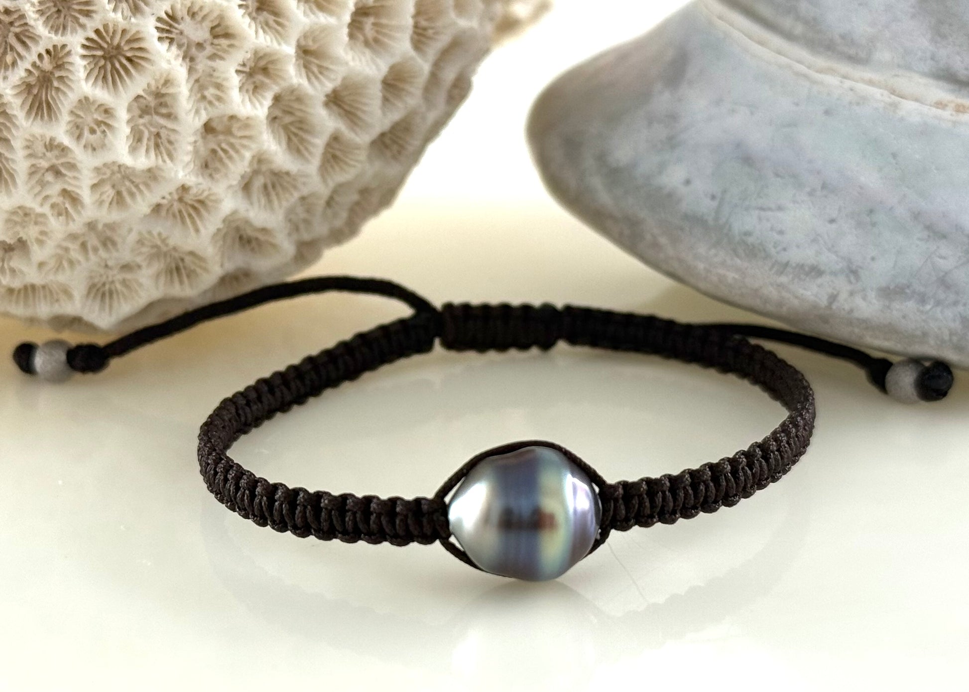 A 10mm green purple circle pearl on a macrame leather bracelet.