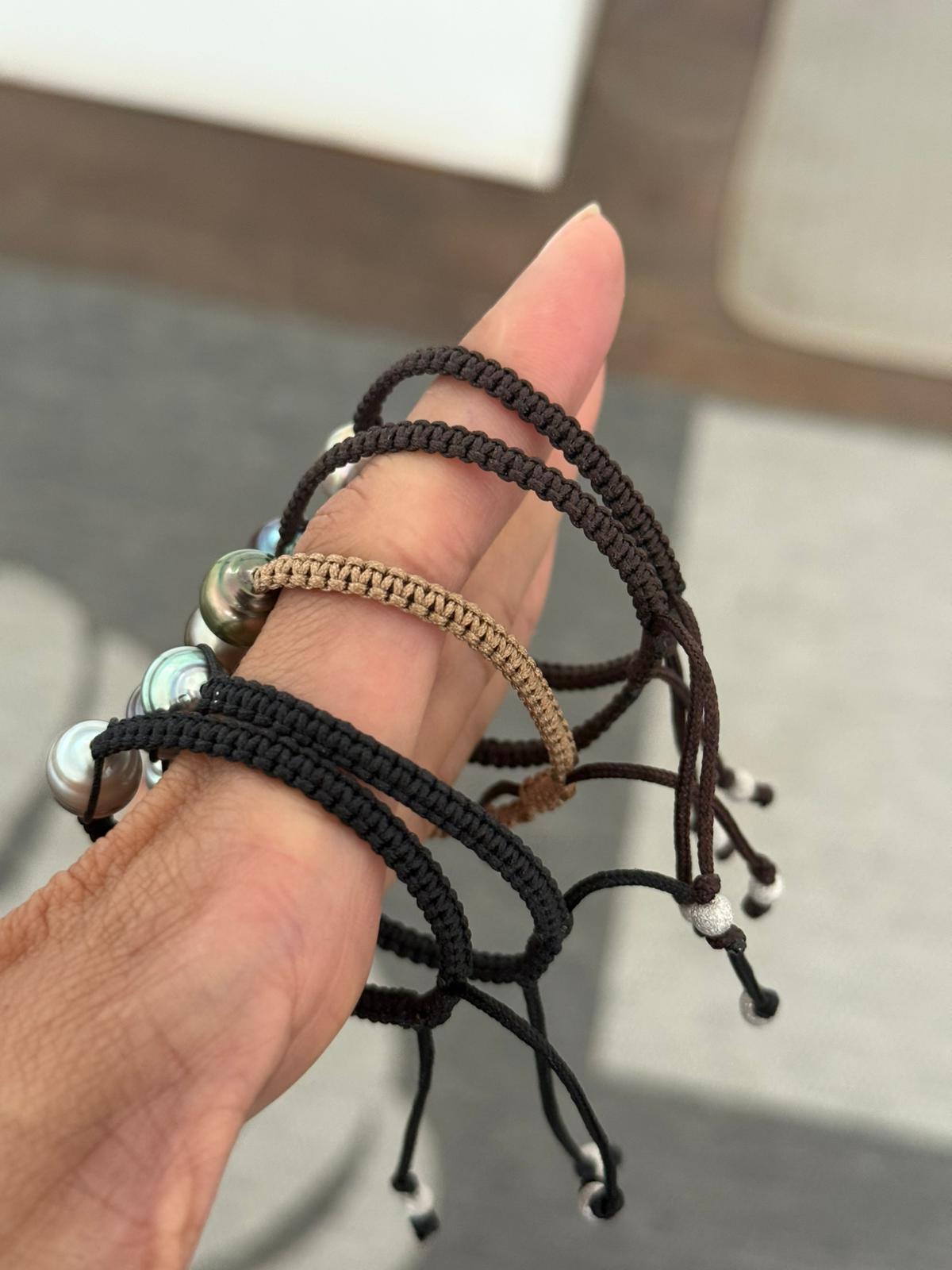 Three 10.1 - 10.3 taupe, vivid green, aqua circle pearls on a bronze macrame leather bracelet cord.